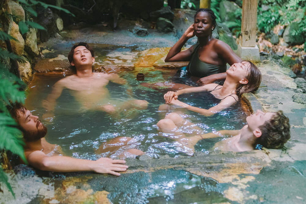 温泉を堪能!自然の中での温泉は最高。泥湯・源泉の湯・せせらぎの湯など8種類の温泉も楽しめちゃう。お話ししたり、自然の音に耳を傾けたり、自分たちのペースで、リラックス。