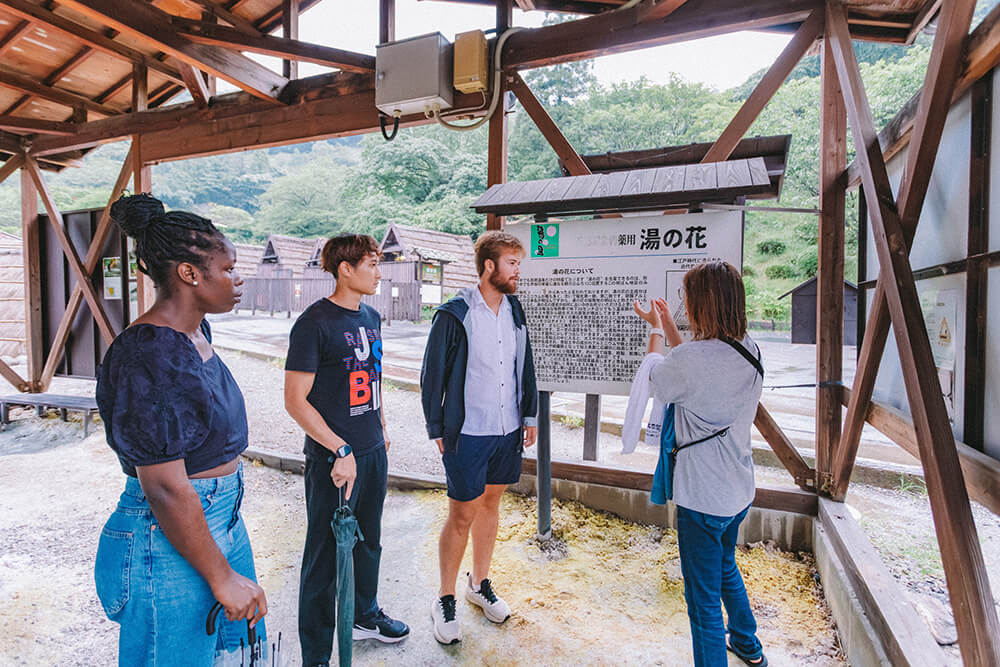 湯の花小屋見学。江戸時代(300年前)から続いている伝統的な技術で作られているのは、ここ明礬だけ。紡がれている知恵、職人さんの技術、自然の奇跡が生み出した、国の重要無形民俗文化財。