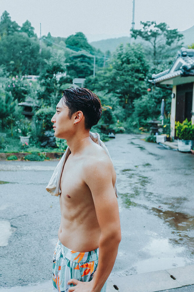 温泉から出たら土砂降り!灯りに照らされた雨がとても気持ちよさそうで、思わず雨の中へ。笑いながら見守ってくれて、一緒にまた濡れて(笑)大きなタオルで包んでくれた。ありがとう。